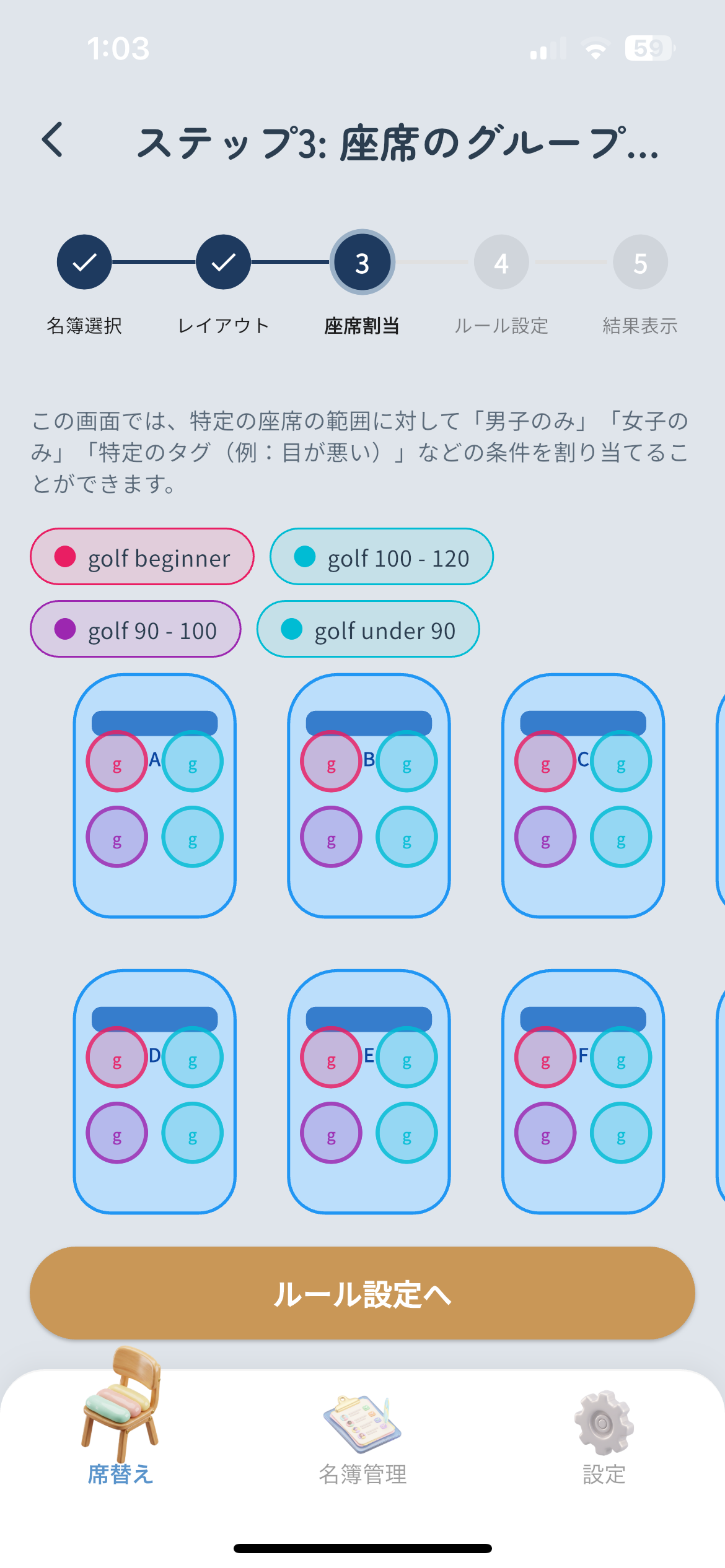 「席替え先生」はもともとクラスの席替えや飲み会の座席決めに使うアプリですが、その「飲み会モード」がゴルフコンペのパーティ分けに最強のツールとして機能します。